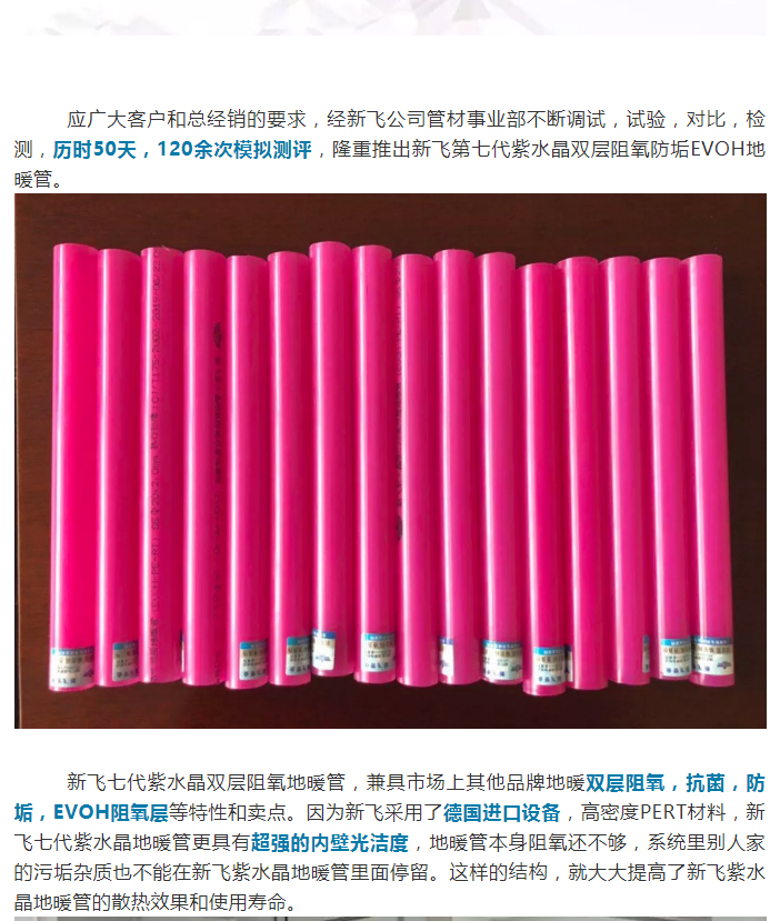 4、長(zhǎng)久耐用:地暖管由于是在地板下面,所以它處在混凝土全包狀態(tài),與外界氧氣完全隔離,只要我們保養(yǎng)得當(dāng),可以使用七十年之久,所以做為地暖廠家可以自豪的承諾,我們質(zhì)保五十年;而這個(gè)年限計(jì)算的話,它每天的平均費(fèi)用可謂是低得不能再低了;